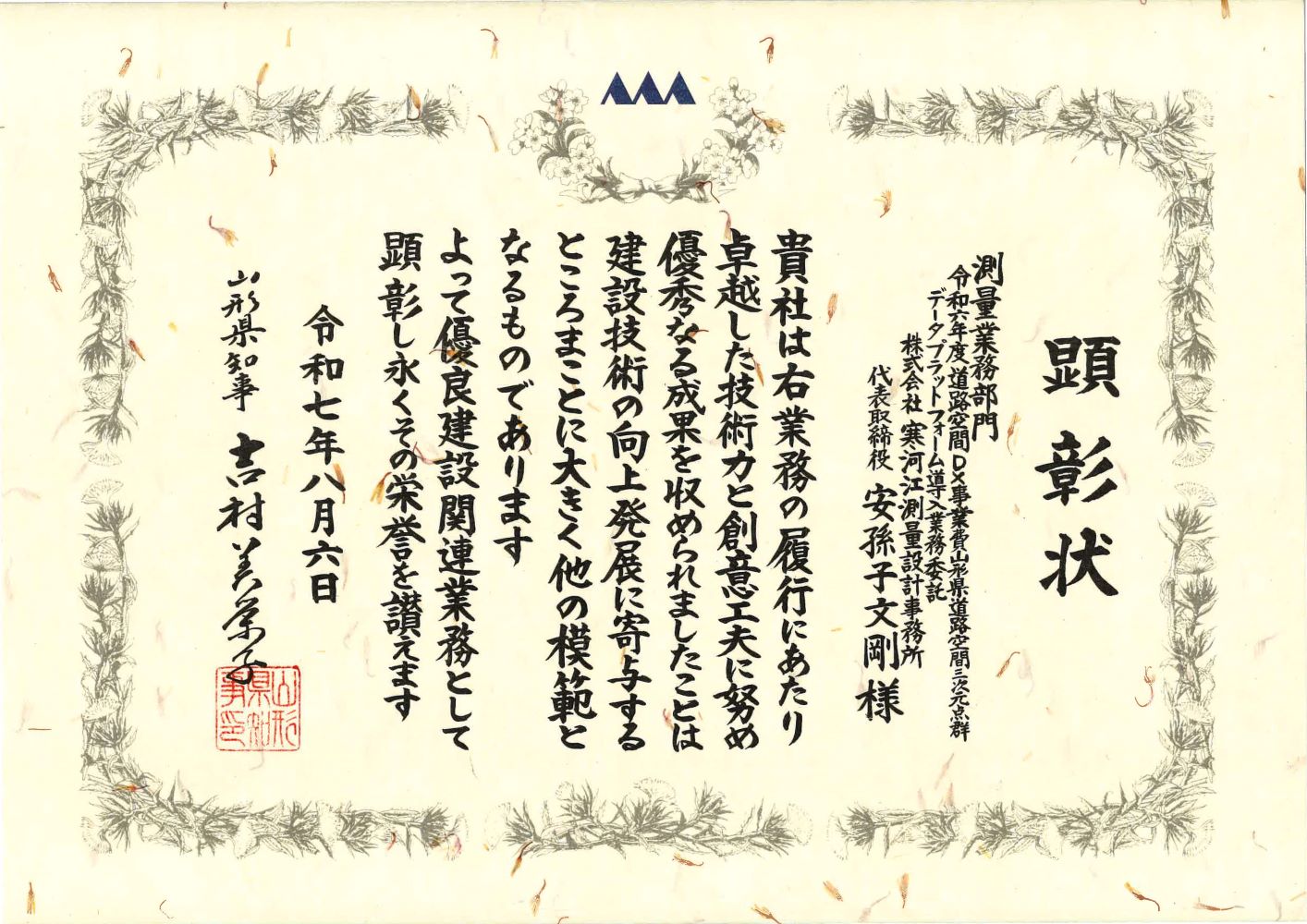 令和7年8月6日に「令和6年度道路空間DX事業費山形県道路空間3次元点群データプラットフォーム導入業務委託」の業務について、令和7年度山形県優良建設工事等顕彰をいただきました。令和7年度 山形県優良建設工事等顕彰は県内建設関連企業の技術力向上等を目的に実施している表彰制度です。